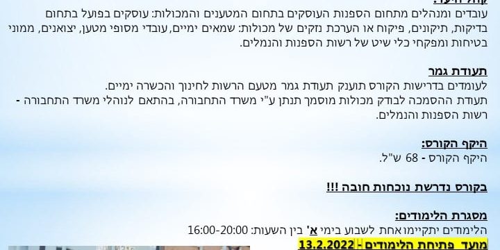 ינו122022כללי קורס בודקי מכולות נדחה לתאריך 13.2.2022. בעקבות מצב התחלואה הגבוה בתקופה זו הוחלט לדחות את פתיחת הקורס לתאריך 13.2.2022. זו הזדמנות טובה למי שלא הספיק להירשם, ליצור איתנו קשר ולתפוס מקום בקורס. לפרטים נוספים ולהרשמה: 04-9911016 Post navigationPreviousPrevious post:קורס כיבוי אש והישרדות משיטים 30-31.1.22NextNext post:סיום קורס מפקחי תצפית (VTSS)פוסטים קשוריםקורס מנהלי מרינות ומעגנות- הראשון בישראל!אוקטובר 26, 2025קורס STCW משולב קצינים + דירוגים + משיטיםאוקטובר 23, 2025קורס משיט 7 ייפתח ב- 2.11.25ספטמבר 16, 2025פתיחת קורסי קצונה ימית 4.1.2026אוגוסט 27, 2025