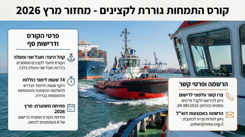 פבר162026כללי נפתחה ההרשמה לקורס התמחות גוררת לקצינים- חובל שני ומעלה. סה"כ שעות- 74 פתיחה משוערת – מרץ 2026 מותנה במספר מינימלי של משתתפים (6 לפחות) למעוניינים, אנא צרו קשר בטלפון: 04-9911016 או במייל: zohar@imta.org.il Post navigationPreviousPrevious post:קורס מודעות בטחונית ימית- פברואר 2026פוסטים קשוריםקורס מודעות בטחונית ימית- פברואר 2026פברואר 16, 2026אתגר "אני קצין בצי הסוחר הישראלי" בדף הפייסבוק שלנוינואר 29, 2026קורס כיבוי אש והישרדות בים 25-26.2.2026ינואר 29, 2026קורס חדש בתמרון אוניות לרבי חובלים וקצינים בכירים מחברת "צים"ינואר 26, 2026