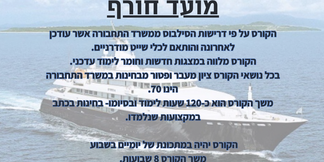 אוג212023כללי הקורס יתקיים במתכונת של יומיים בשבוע למשך 8 שבועות. פרטים נוספים למעלה. Post navigationPreviousPrevious post:פתיחת כיתת מטאורולוגיה ברשות 3.8.23NextNext post:פטירת ראש ענף סיפון לשעבר ר/ח דני ברנדרפוסטים קשוריםקורס מנהלי מרינות ומעגנות- הראשון בישראל!אוקטובר 26, 2025קורס STCW משולב קצינים + דירוגים + משיטיםאוקטובר 23, 2025קורס משיט 7 ייפתח ב- 2.11.25ספטמבר 16, 2025פתיחת קורסי קצונה ימית 4.1.2026אוגוסט 27, 2025