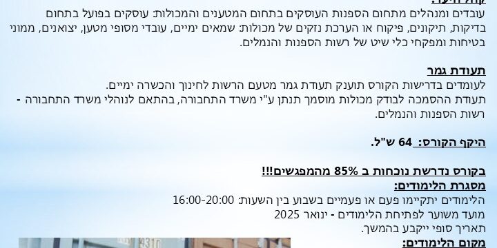 דצמ222024כללי קורס בודקי מכולות מתוכנן להיפתח ברשות בחודש ינואר 2025. למעוניינים להירשם או לקבל פרטים על הקורס אנא צרו קשר דרך המזכירות 04-9911016 או במייל – zohar@imta.org.il Post navigationPreviousPrevious post:קורס כיבוי אש והישרדות למשיטים 27-28.1.25NextNext post:קורס "קצין מכונה משמרת מוגבל" (קצין מכונה גוררת)פוסטים קשוריםדרגת רב חובל בכיר- רח"ב מיכאל חלפיןאוקטובר 29, 2025קורס מנהלי מרינות ומעגנות- הראשון בישראל!אוקטובר 26, 2025קורס STCW משולב קצינים + דירוגים + משיטיםאוקטובר 23, 2025קורס משיט 7 ייפתח ב- 2.11.25ספטמבר 16, 2025