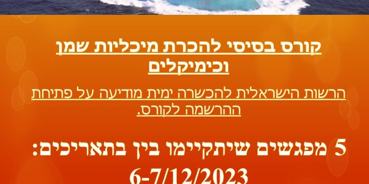 נוב272023כללי Post navigationPreviousPrevious post:מענקים לקציני ים בוגרי קורס צועריםNextNext post:הדלקת נרות חנוכה ברשותפוסטים קשוריםדרגת רב חובל בכיר- רח"ב מיכאל חלפיןאוקטובר 29, 2025קורס מנהלי מרינות ומעגנות- הראשון בישראל!אוקטובר 26, 2025קורס STCW משולב קצינים + דירוגים + משיטיםאוקטובר 23, 2025קורס משיט 7 ייפתח ב- 2.11.25ספטמבר 16, 2025