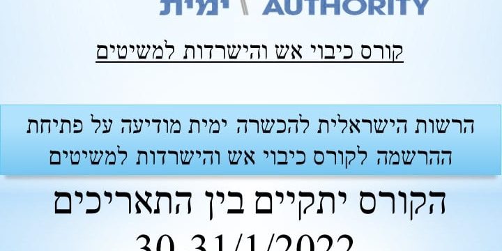 ינו42022כללי קורס כיבוי אש והישרדות משיטים יתקיים ברשות בין התאריכים 30-31.1.22. פרטים נוספים בטלפון: 04-991116 Post navigationPreviousPrevious post:הודעה חשובה מרספ"ן- רישום למחזור 5 של קורס ריענון STCW שייפתח במרץ 2022. הרישום ברספ"ן בלבדNextNext post:הודעה חשובה- קורס בודקי מכולות נדחה לתאריך 13.2.2022פוסטים קשוריםקורס מנהלי מרינות ומעגנות- הראשון בישראל!אוקטובר 26, 2025קורס STCW משולב קצינים + דירוגים + משיטיםאוקטובר 23, 2025קורס משיט 7 ייפתח ב- 2.11.25ספטמבר 16, 2025פתיחת קורסי קצונה ימית 4.1.2026אוגוסט 27, 2025