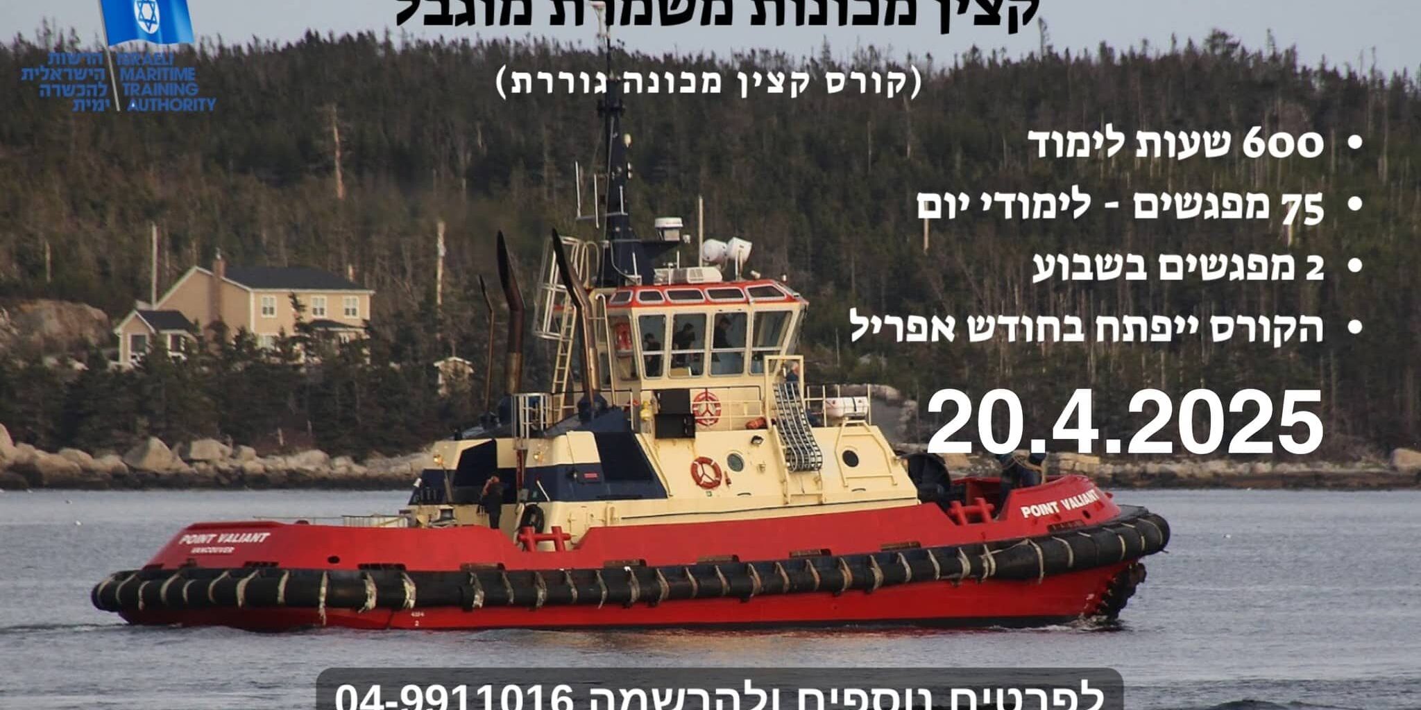 כל המעוניינים להצטרף לקורס "קצין מכונה משמרת מוגבל" (קצין מכונה גוררת), ועומדים בתנאים המצורפים, מוזמנים ליצור איתנו קשר בטלפון לפרטים נוספים ולהמשך תהליך.