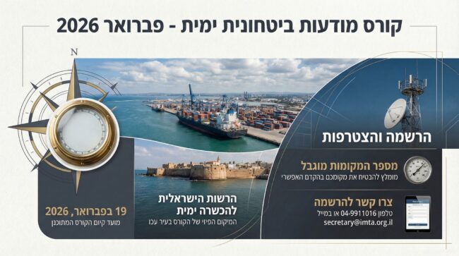 תאריך הקורס: 19.02.2026 מיקום: הרשות הישראלית להכשרה ימית (עכו) מספר המקומות מוגבל. לפרטים והרשמה: בטלפון: 04-9911016 במייל: secretary@imta.org.il