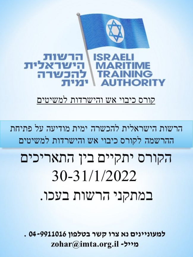 קורס כיבוי אש והישרדות משיטים יתקיים ברשות בין התאריכים 30-31.1.22. פרטים נוספים בטלפון: 04-991116