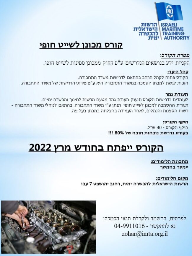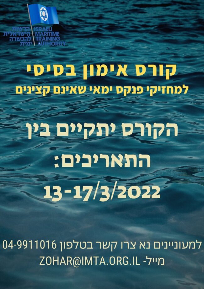 קורס אימון בסיסי למחזיקי פנקס ימאי שאינם קצינים יתקיים ברשות בין התאריכים 13-17.3.22. פרטים נוספים בטלפון: 04-9911016 מייל: zohar@imta.org.il